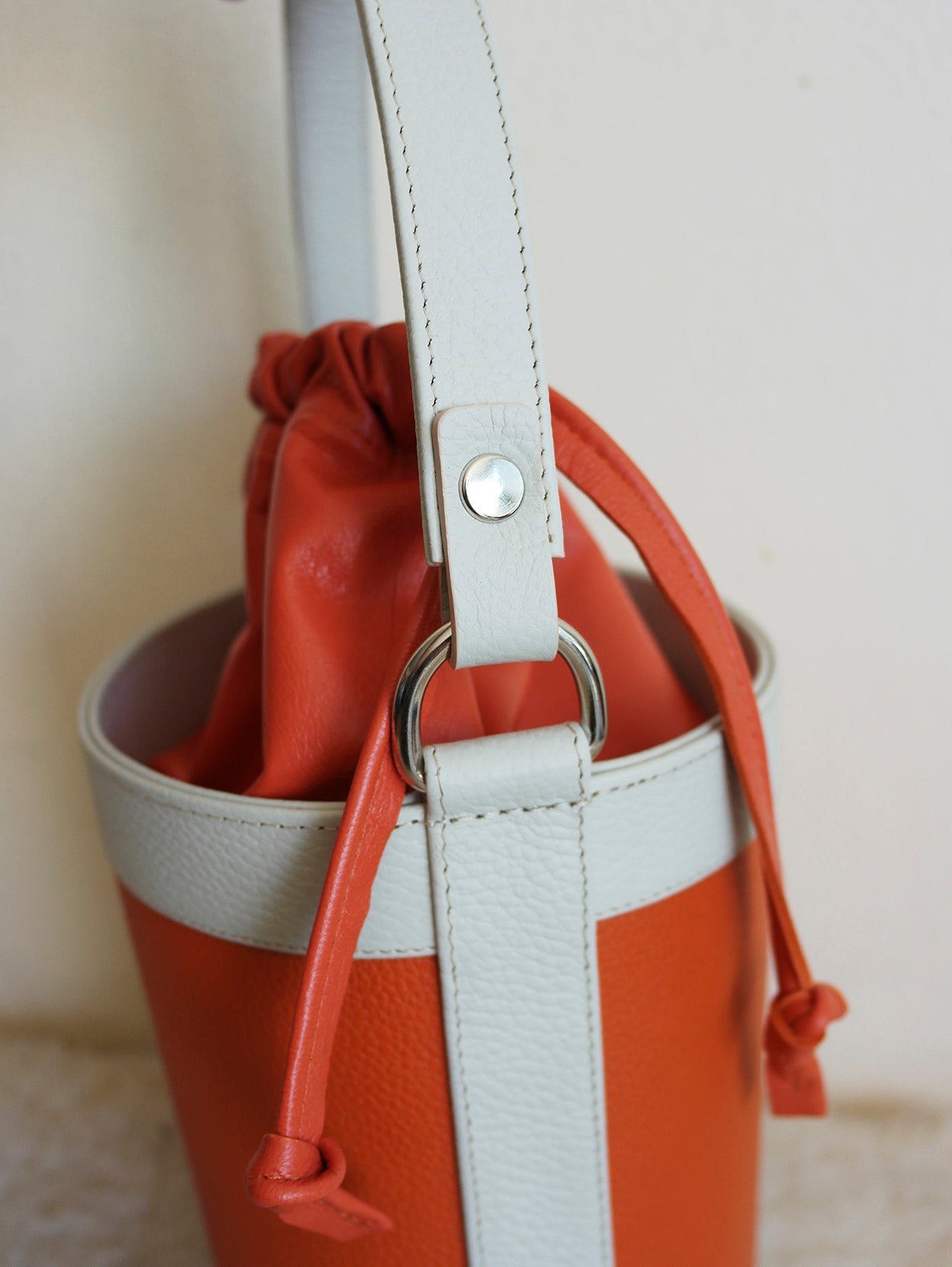 Colores: Naranja y beige. Herrajes metálicos plateados.
