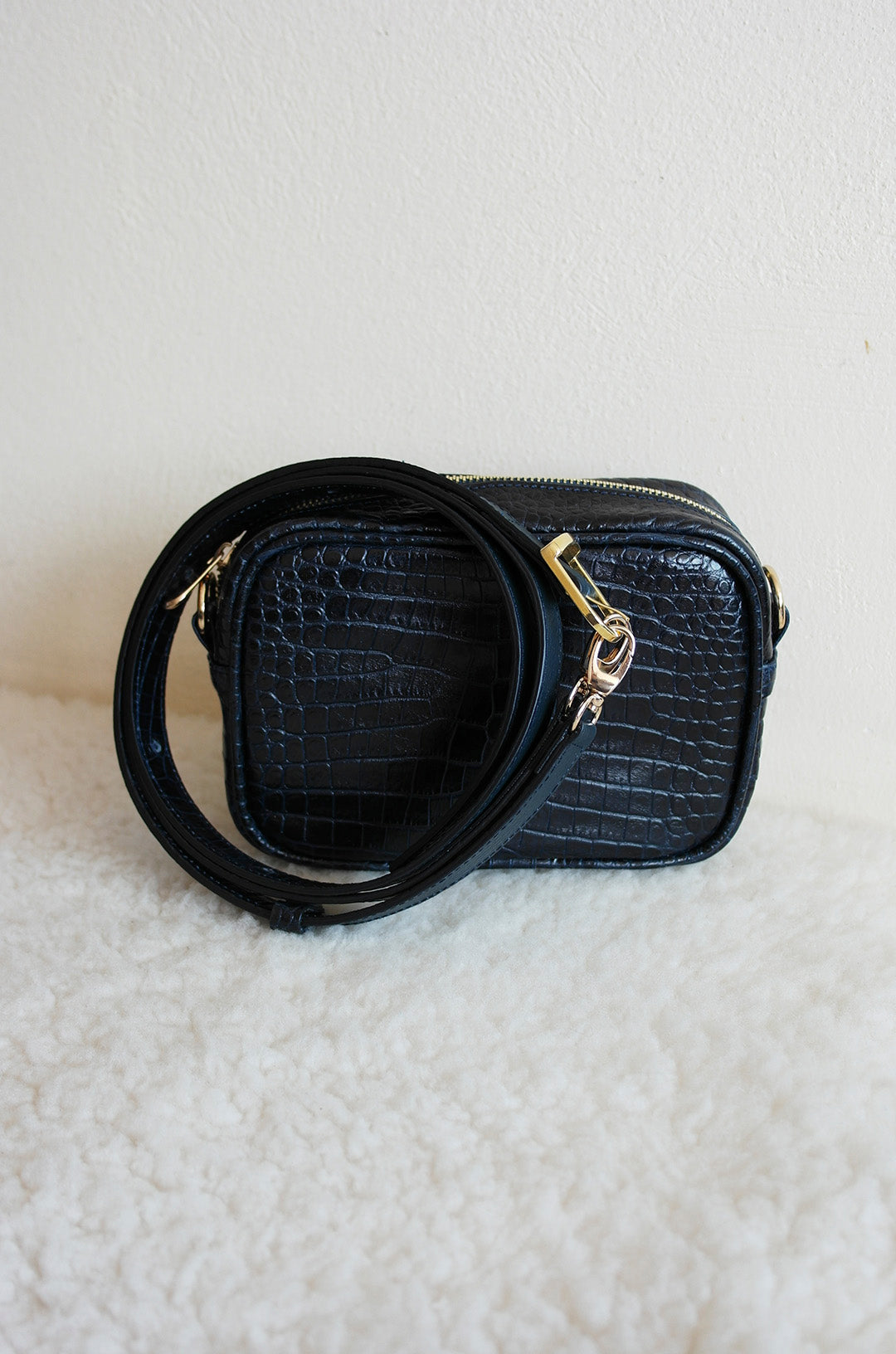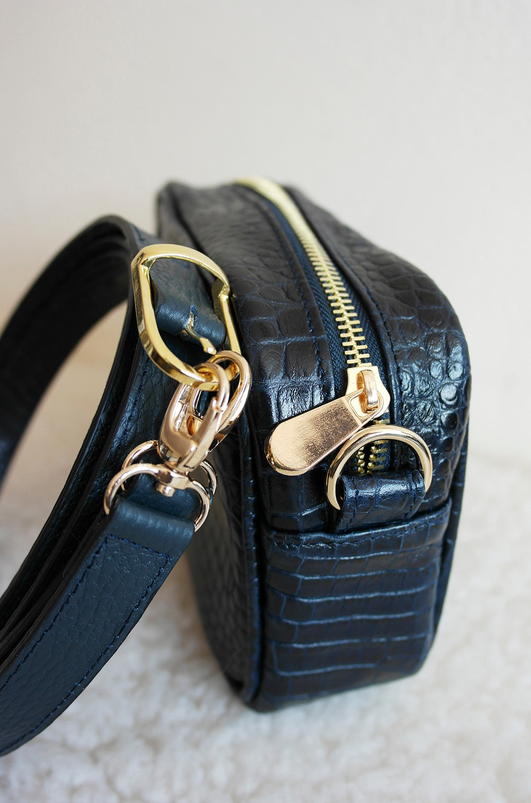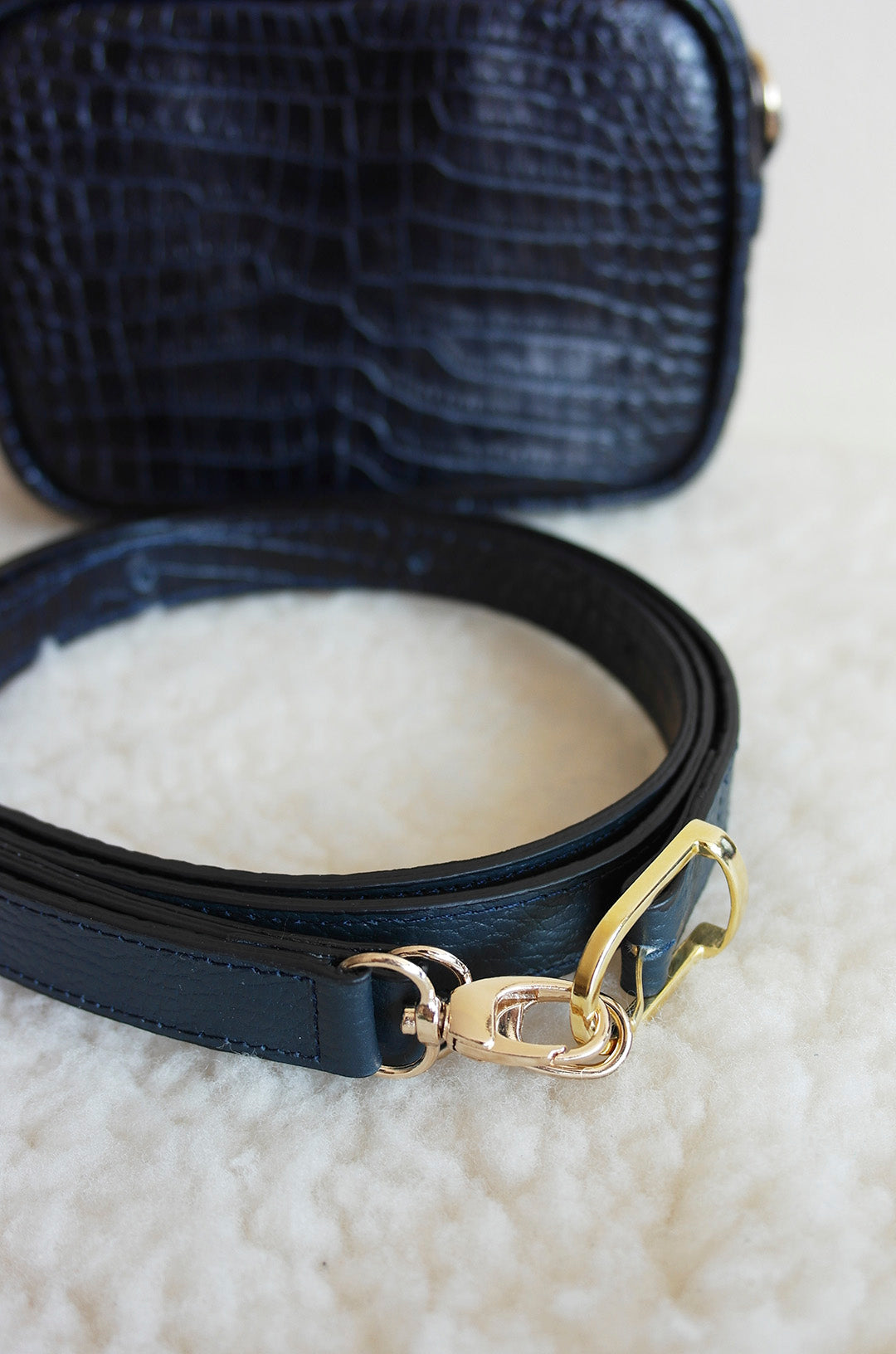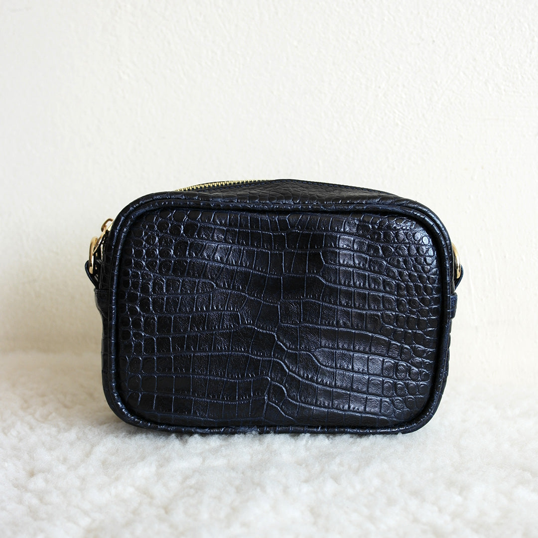 Materiales: Piel bovina con impresión tipo cocodrilo color azul marino. Herrajes dorados.