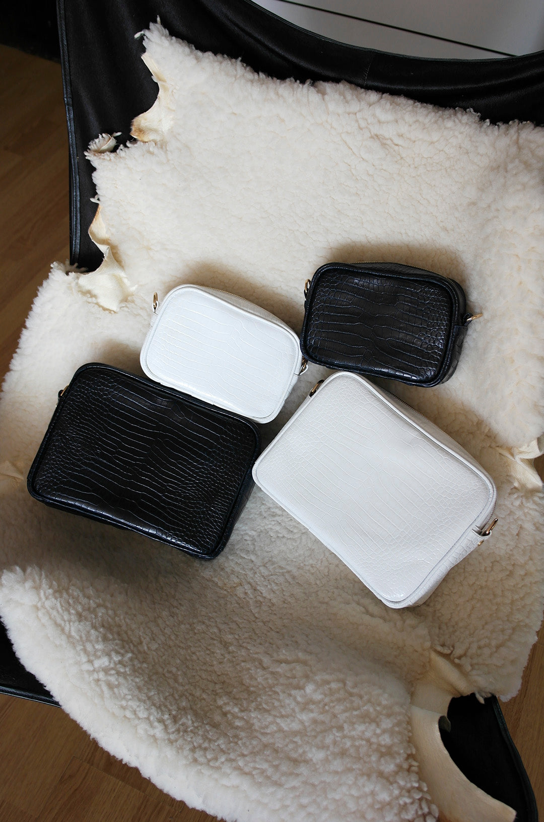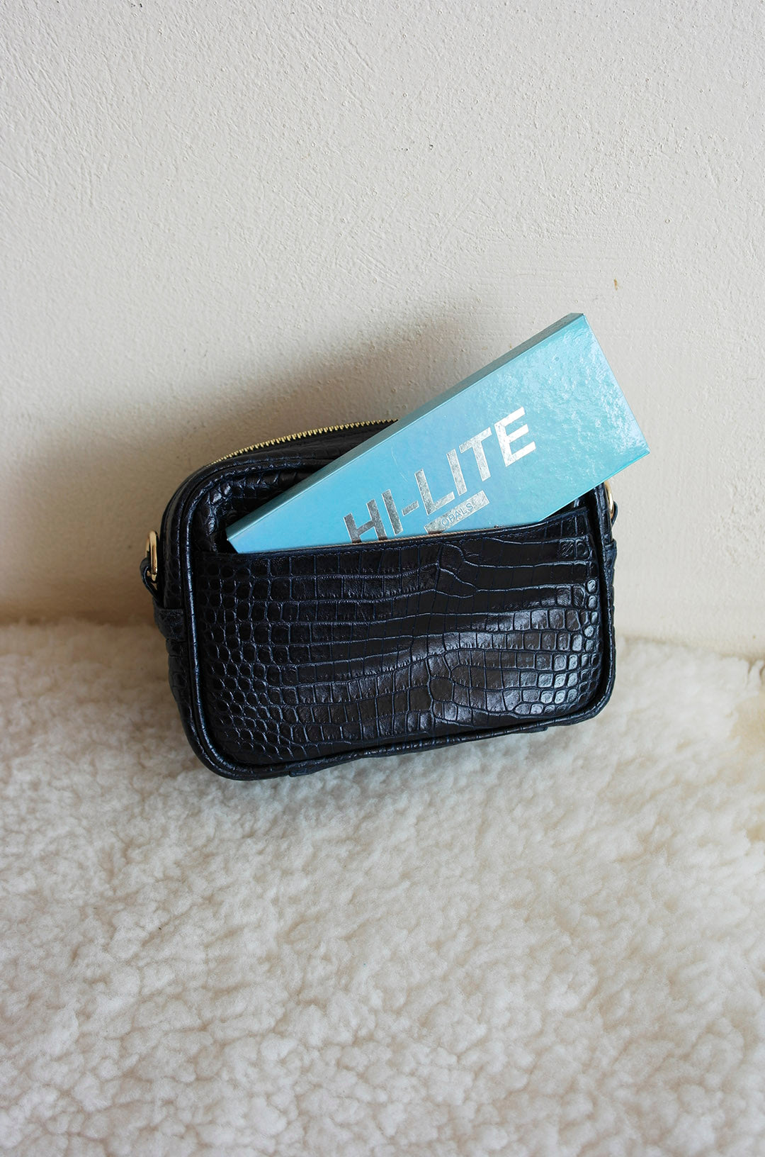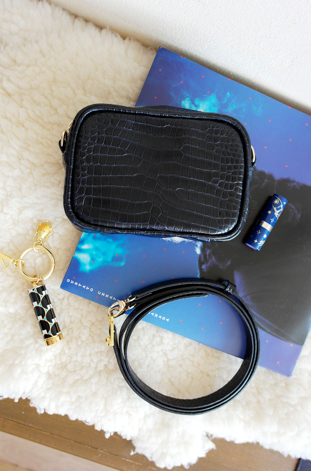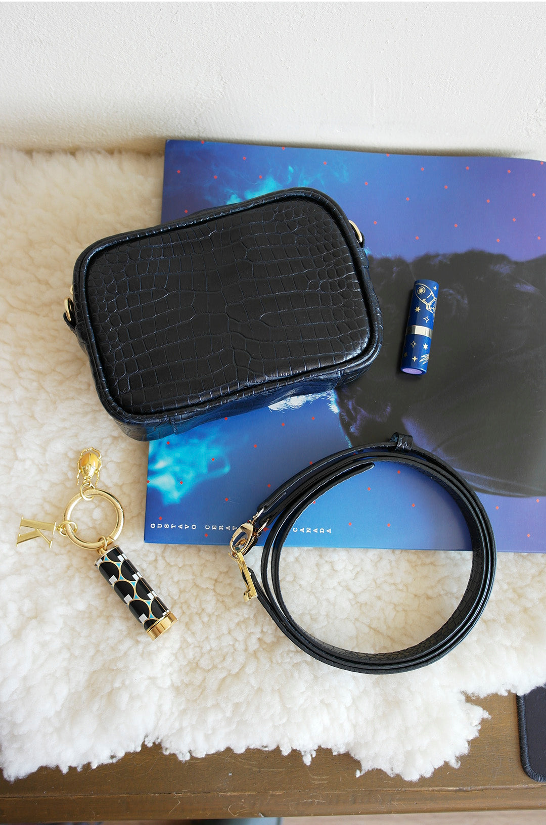 Materiales: Piel bovina con impresión tipo cocodrilo color azul marino. Herrajes dorados.