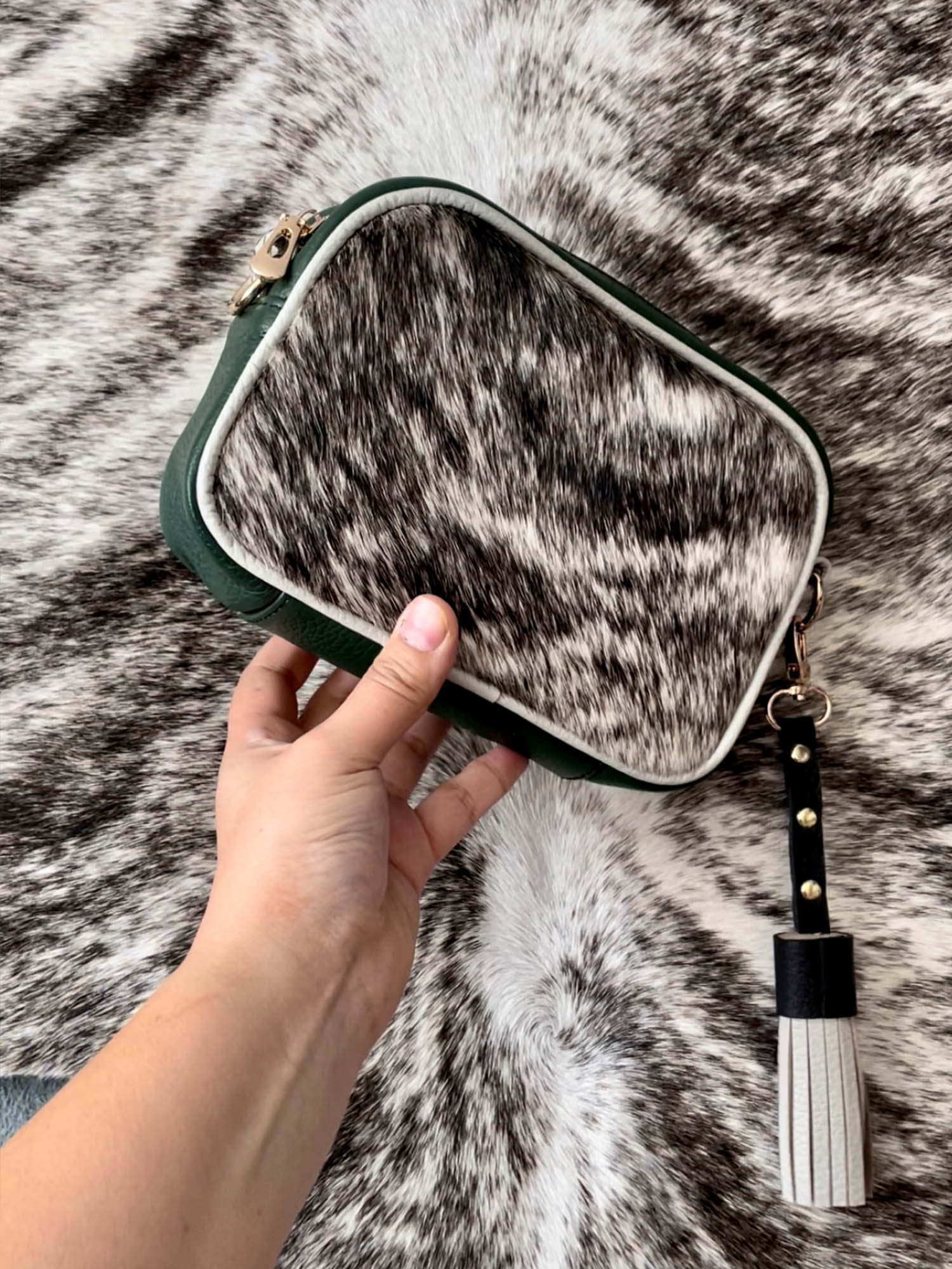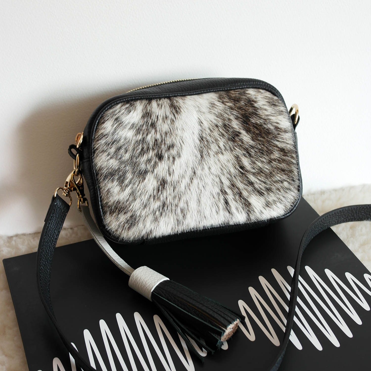 Materiales: Piel vacuna, piel de pelo corto y herrajes metálicos dorados.